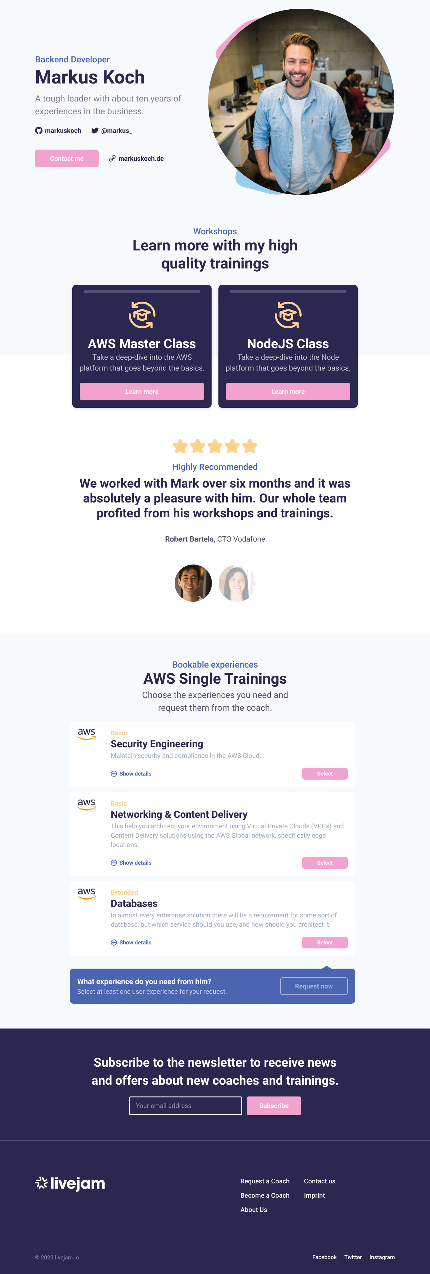 A coach gets his own profile on which he can present his most important information, workshops and experiences.