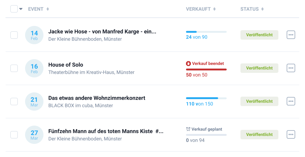 All events of an organizer with different states are displayed. The user can perform short interactions such as editing, duplicating or deleting an event. He also gets an overview of the ticket sales history.