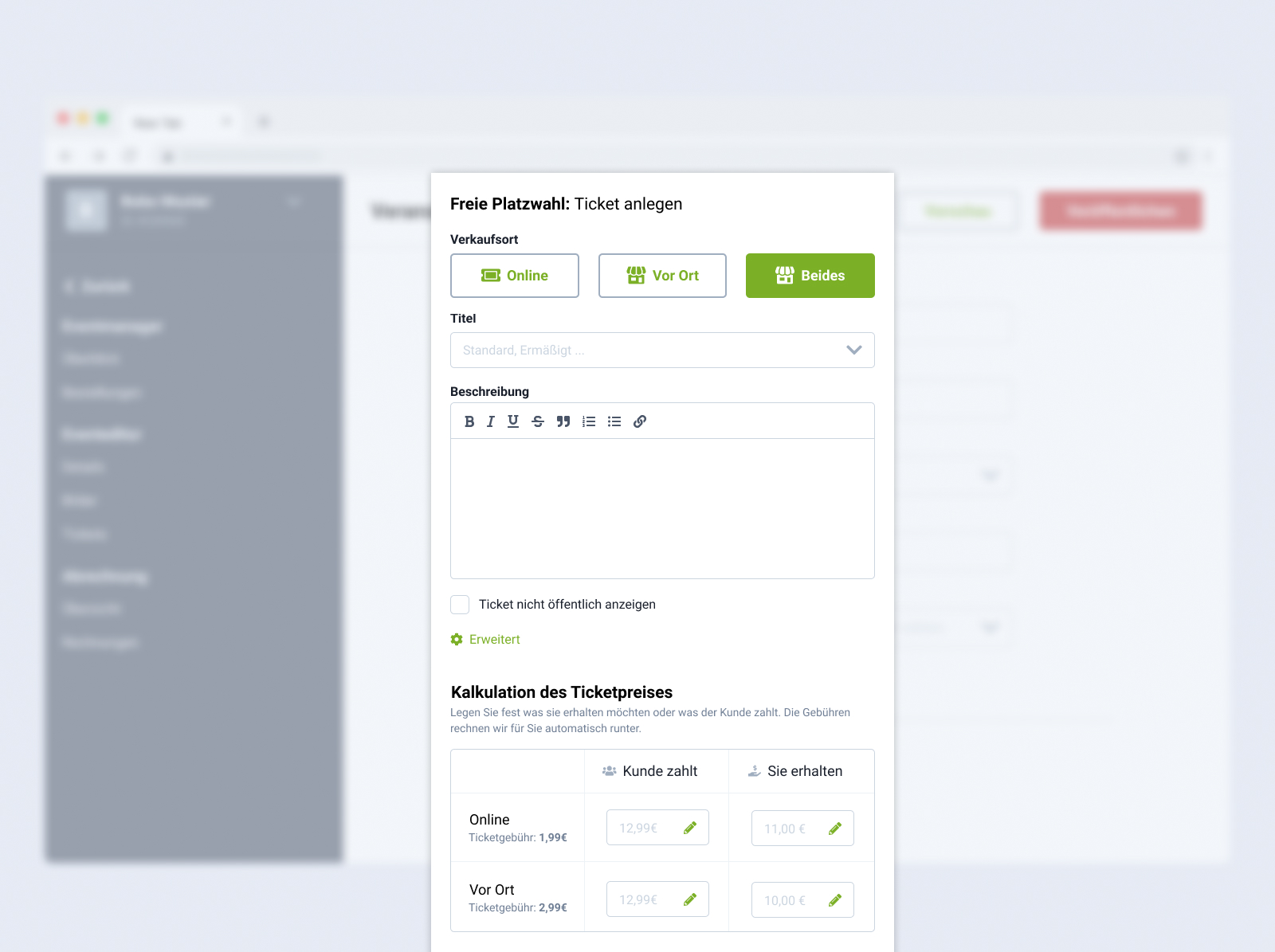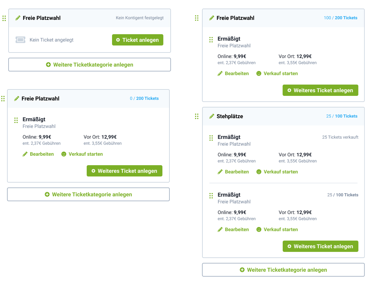 A simplified process that allows you to create tickets for an event. The Venue, categories and prices including the calculation of fees are displayed - for buyer and Organizer.